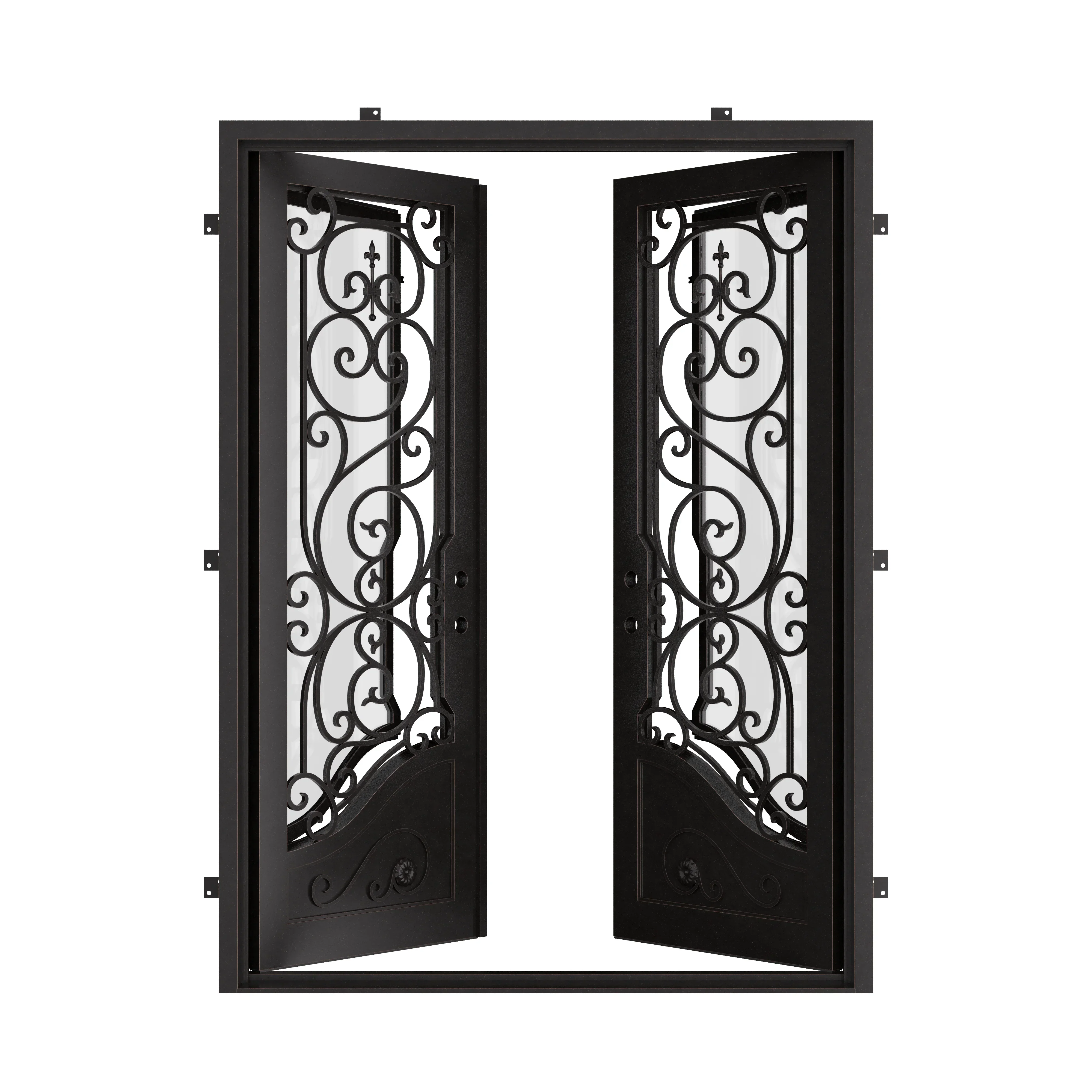 With its elegant design, the Beverly entry double iron door embodies pure sophistication. Each entrance into your home becomes a grand experience, courtesy of this meticulously crafted masterpiece. Its organic and fluid pattern, accompanied by a unique bottom panel on each iron door, creates a captivating contrast. The Beverly not only boasts unmatched aesthetic appeal, but also offers convenience and security with its operable hinged 5/8" tempered dual pane glass panel. This feature allows for easy cleaning, ventilation, and added peace of mind. Welcome your guests in true style with the timeless allure of the Beverly.