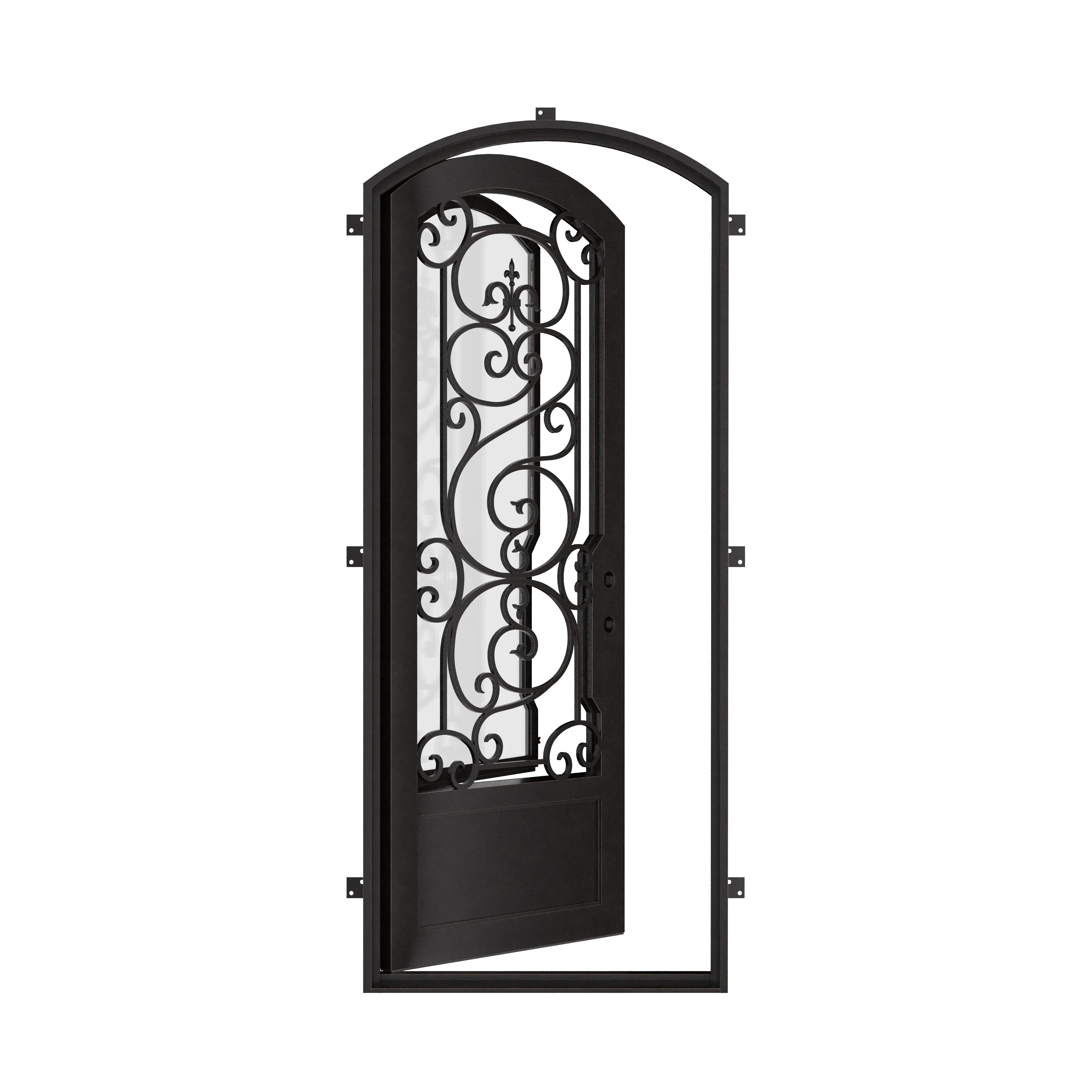 The Beverly entry single iron door design is the epitome of elegance. The aesthetic appeal of this sophisticated and meticulous design will certainly make every entrance into your home a grand one. This luxurious single iron door design features a fluid and organic pattern and a unique bottom panel on the iron door that provides the perfect contrast. Not only does the Beverly have an unmatched aesthetic appeal, but it also features an operable hinged 5/8" tempered dual pane glass panel that opens independently from the metal door for convenient cleaning, ventilation, and security. The Beverly will certainly welcome your guests in style.