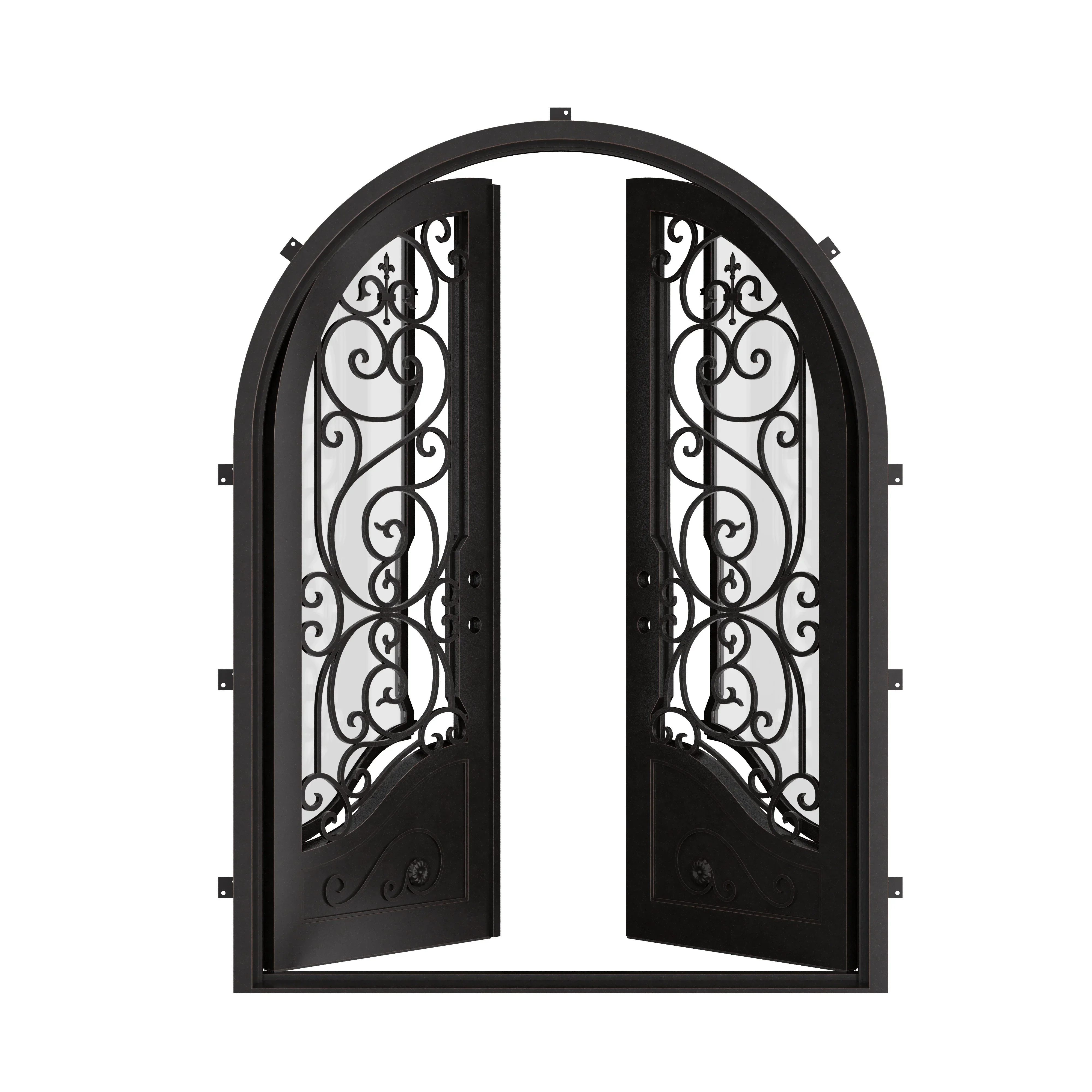 The Beverly entry double iron door design is the epitome of elegance. The aesthetic appeal of this sophisticated and meticulous design will make every entrance into your home a grand one. This luxurious double iron door design features a fluid and organic pattern and a unique bottom panel on each iron door that provides the perfect contrast. Not only does the Beverly have an unmatched aesthetic appeal, but it also features an operable hinged 5/8" tempered dual pane glass panel that opens independently from the metal door for convenient cleaning, ventilation, and security. The Beverly will certainly welcome your guests in style.