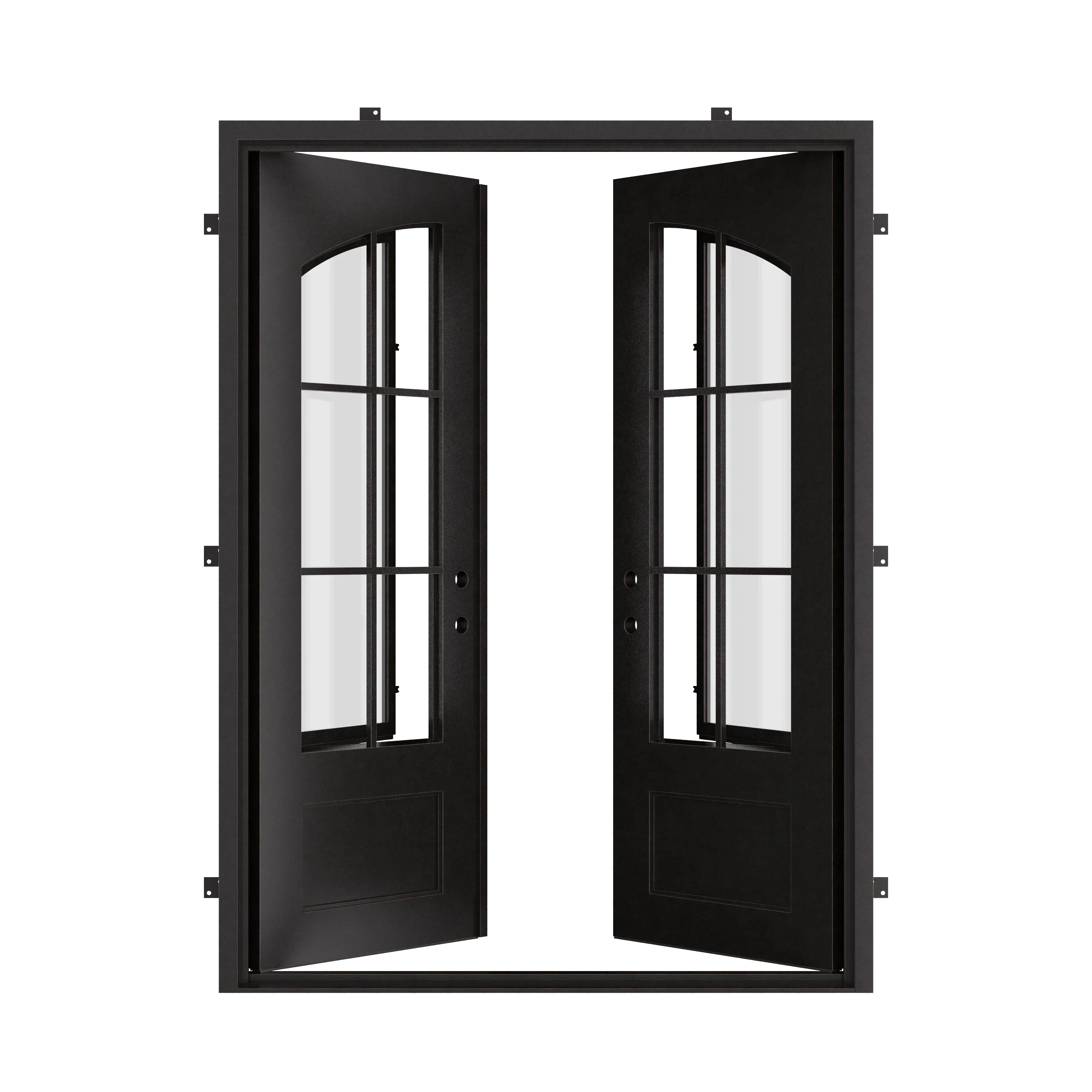 This design blends modern and classic styles by incorporating an illusion arch and bottom panel on each iron door to enhance its appearance. The double iron door looks contemporary due to its clean lines and uncomplicated details, while the illusion arch adds a touch of timeless sophistication. Pinky's Iron Doors has a collection called Air, which includes a unique piece called the Bristol. This contemporary and minimalistic collection was designed with modern homes in mind, featuring sleek and simple steel windows and doors with unique hardware that prioritizes linear designs over organic ones.