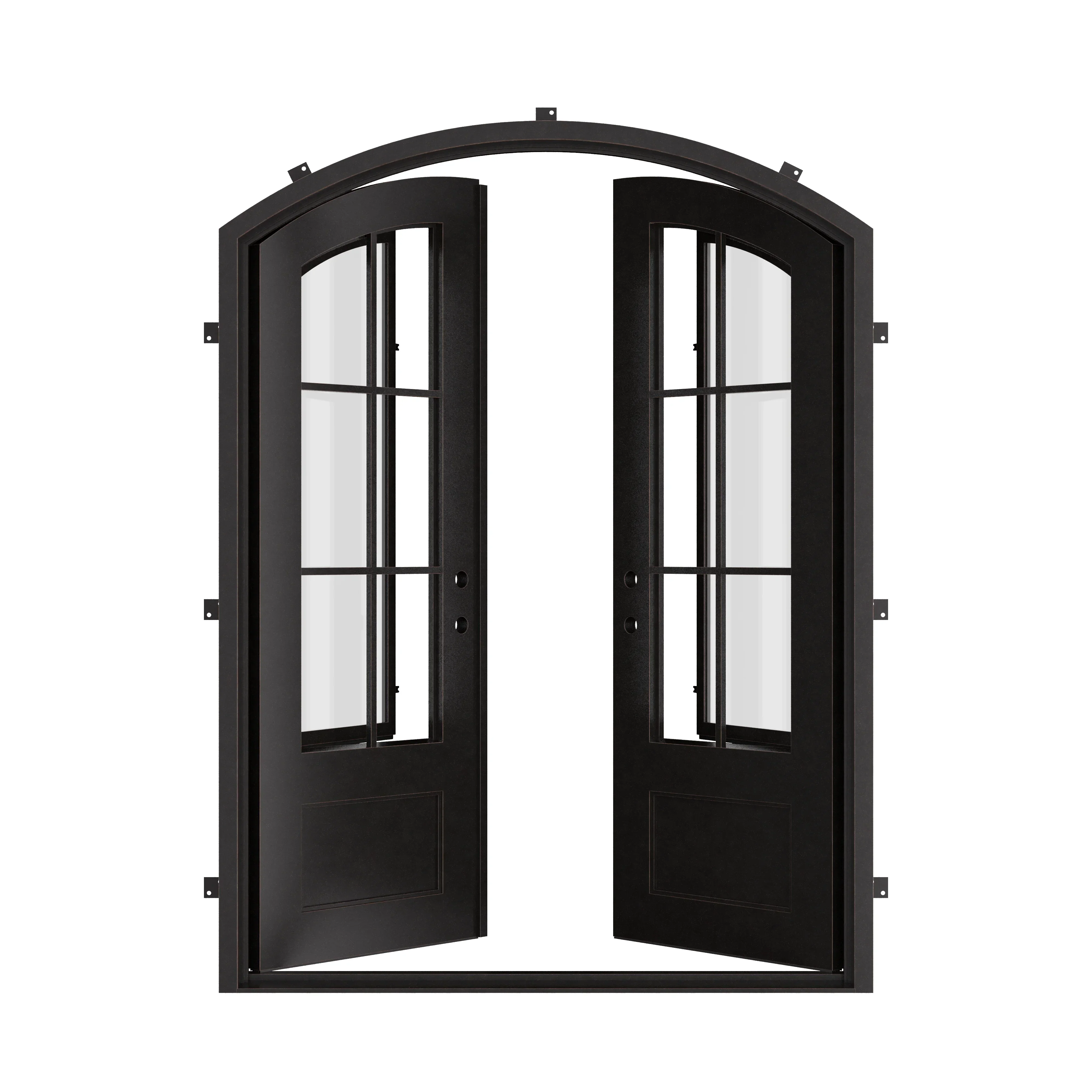 The double iron doors have a unique design that combines modern and classic elements. They feature an illusion arch and a bottom panel that perfectly complement their elegant and modern style. The illusion arch has a traditional aesthetic that adds to the overall look of the doors. Pinky's Iron Doors has introduced a new collection named "Air," which includes a modern product referred to as "Bristol." This collection consists of steel doors and windows that feature minimalist and contemporary designs, ideal for modern homes. The products are outfitted with high-quality hardware and highlight simple, angular shapes, rather than curved or organic shapes.