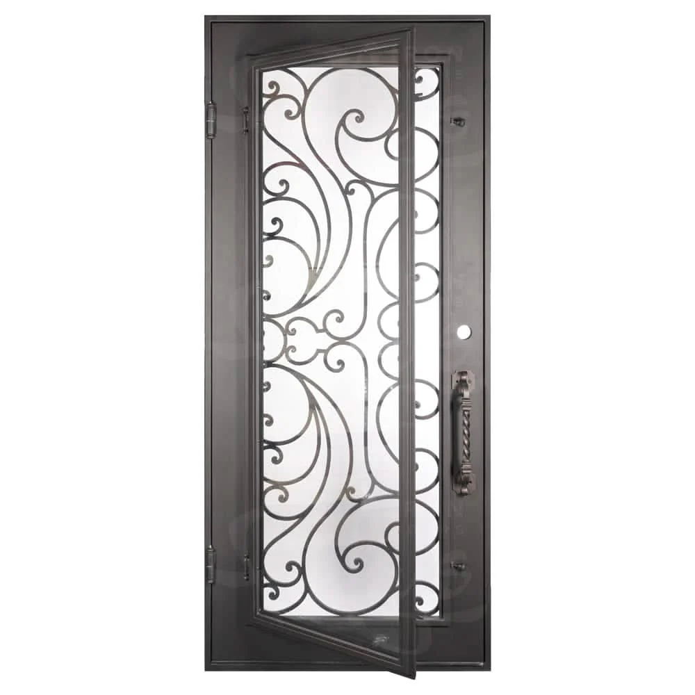 Meet our new Sunset Single iron entry door. Representing a sun setting scene, this door's sophisticated iron work paired with it's full length operable glass panel gives this iron entry door a beautiful aesthetic. With a single dead bolt bore hole and pull handles included, all you need is a deadbolt to secure. With our standard dual pane tempered glass and threshold welded to the frame, this entry iron door is the total package. Worried about our seal? Fear not, as all of our iron entry doors come standard with a weather stripping package fully installed and ready to go. Come check out the Sunset Single iron entry door for a brand new take on the beauty of your sunset today.
