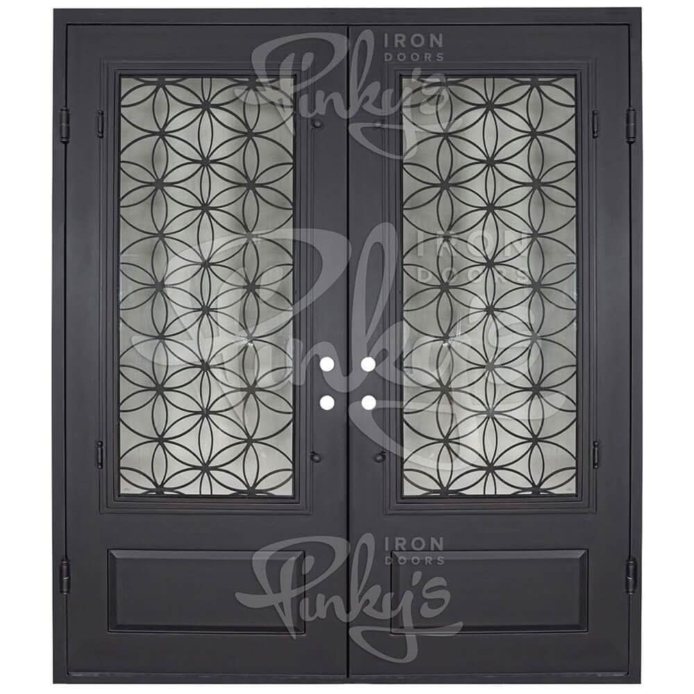 Looking for a double entry iron door that is sure to make your neighborhood envious? Look no further than Pinky's Iron Doors Woodstock double front iron door design. With it's circular star like patterns and bordered lower kick plate panels, this door emits a sense of elegance and style. We have included an operable 5/8" tempered dual pane glass panel that opens when desired, allowing for easy cleaning and a nice breeze on those warm summer nights.